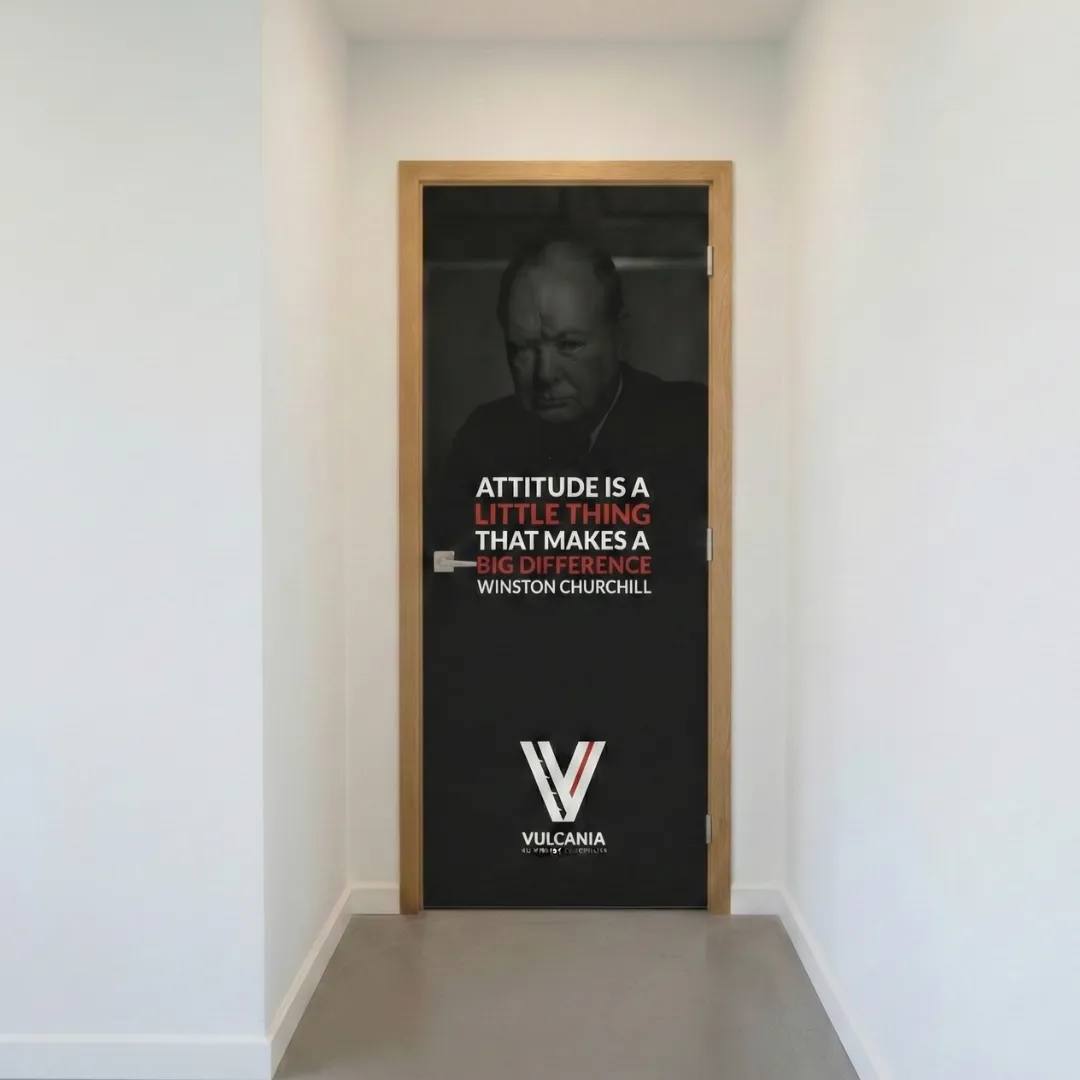 Open the door to good vibes! We designed a bold door wrap with an inspiring quote for Vulcania Reinforcing Solutions. Turning everyday entrances into daily motivation. Because great design should lift spirits too.